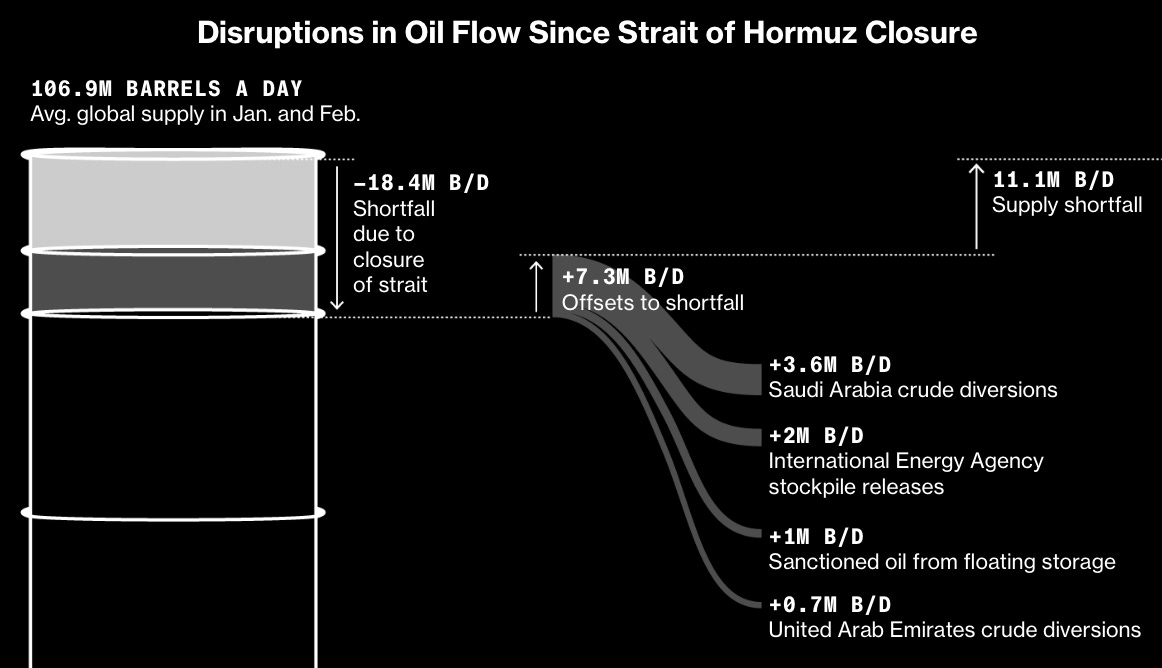 The good news is that there was idle infrastructure already in place to bypass the Strait of Hormuz. According to Bloomberg calculations, Saudi Arabia and the UAE have utilized available routes to reroute approximately 4.5 million barrels per day (mb/d), though roughly 14 mb/d still requires an alternative path.