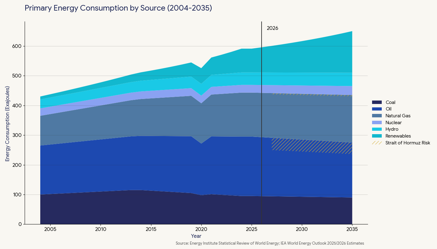 To illustrate the scale of the energy crisis triggered by a potential closure of the Strait of Hormuz, we utilized the IEA Energy Outlook and overlaid the oil and gas volumes that currently flow through this chokepoint: